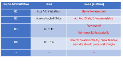Este passo é um pouco mais trabalhoso, exige uma pequena dose de paciência, mas a recompensa é valiosa. Aqui você pode utilizar o sumário de um livro ou uma folha de papel em banco mesmo. Primeiro: identifique o que cada questão está cobrando. Detalhe: será preciso fazer isso com todas as matérias, todas!! Em seguida, veja o que cada alternativa de cada questão está cobrando. Sim, às vezes uma questão cobra mais de um assunto, isso também terá de aparecer no seu Raio-X! Abaixo temos um exemplo de como ficaria um filtro por matéria: